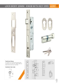 LOCK BODY 20MM - KNOB WITH KEY (095) GEEYES Technical Data: 85 x 20mm Zinc Latch & dead bolt with striker, escutcheon and 55mm brass cylinder with brass knob and 3nos brass keys satin finish. Cylinder hole size GEEYES GEEYES 3