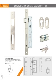 GEEYES LOCK BODY 25MM LATCH (112) Technical Data: 85 x 25mm Zinc Latch & dead bolt with striker, escutcheon and 55mm brass cylinder with 3nos brass keys satin finish. Cylinder hole size GEEYES GEEYES 4