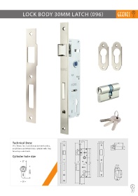 LOCK BODY 30MM LATCH (096) GEEYES Technical Data: 85 x 30mm Zinc Latch & dead bolt with striker, escutcheon and 60mm brass cylinder with 3nos brass keys satin finish. Cylinder hole size GEEYES GEEYES 5